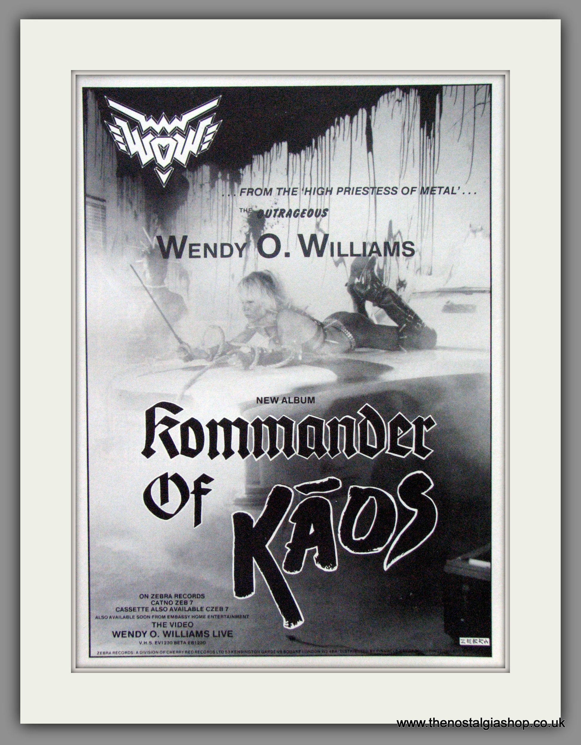 Wendy O. Williams. Kommander of Kaos. Classic Original advert 1987. Presented in cream bevel cut mount with backing card and clear bag. Ready to fit in 14 x 11 inch frame. All our adverts, unless clearly stated are Originals from the date shown. They make excellent pieces of wall art and stunning gifts. Many are rare and hard to find and once sold, may not be replaced. Remember you are buying a piece of history. Website watermark is not on original.