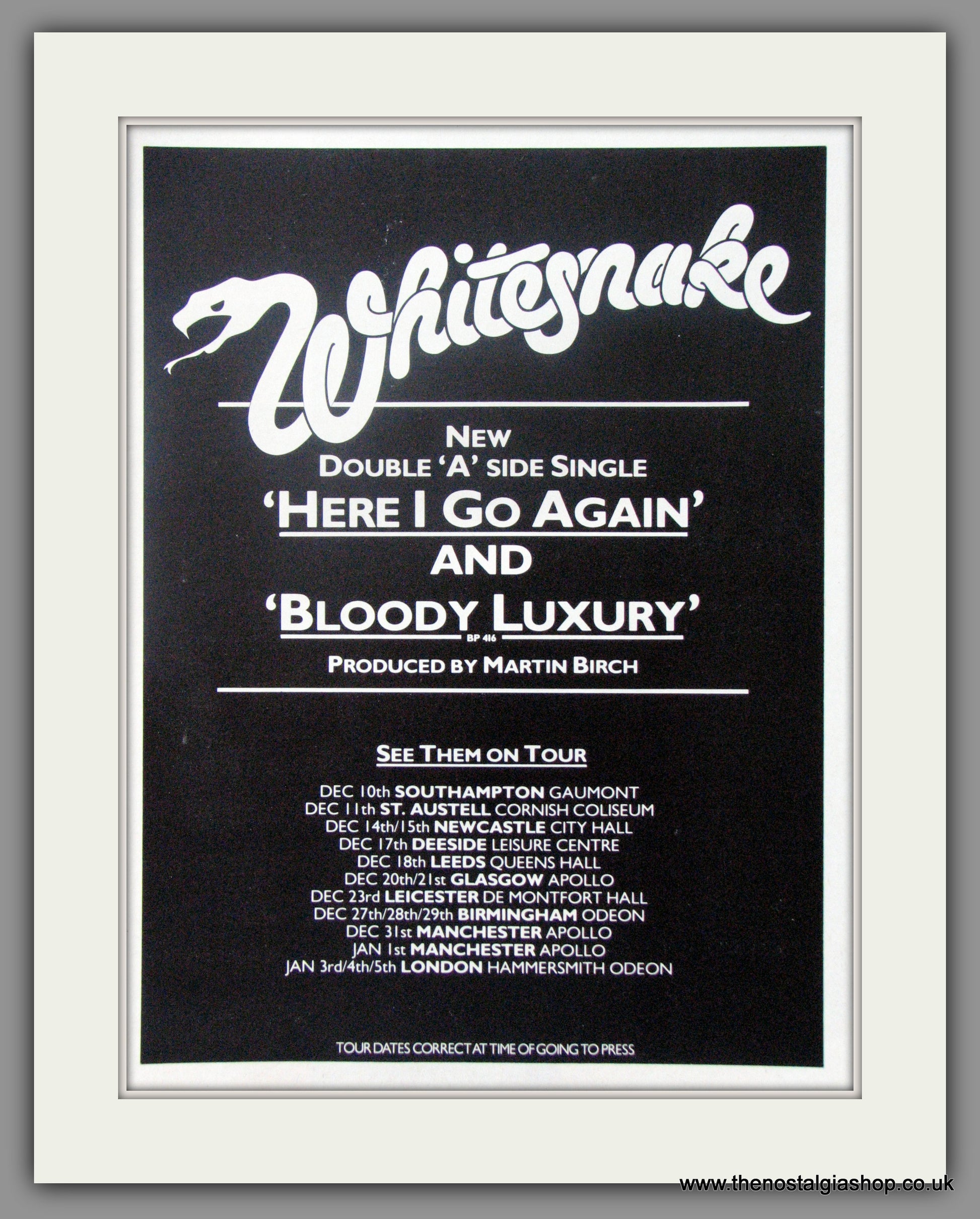 Whitesnake. Here I Go Again, Plus UK Tour Dates. Classic original advert 1982. Presented in cream bevel cut mount with backing card and clear bag. Ready to fit in 14 x 11 inch frame. Want it framing? If so, buy this then go to Frames Available Category. Click to buy on the suitable frame and we will do the rest. All our adverts, unless clearly stated are Originals from the date shown. They make excellent pieces of wall art and stunning gifts. Many are rare and hard to find and once sold, may not be replaced. Remember you are buying a piece of history. Website watermark is not on original. David Coverdale, John Sykes, Tommy Aldridge, Rudy Sarzo, Adrian Vandenberg, Steve Vai, Bernie Marsden.