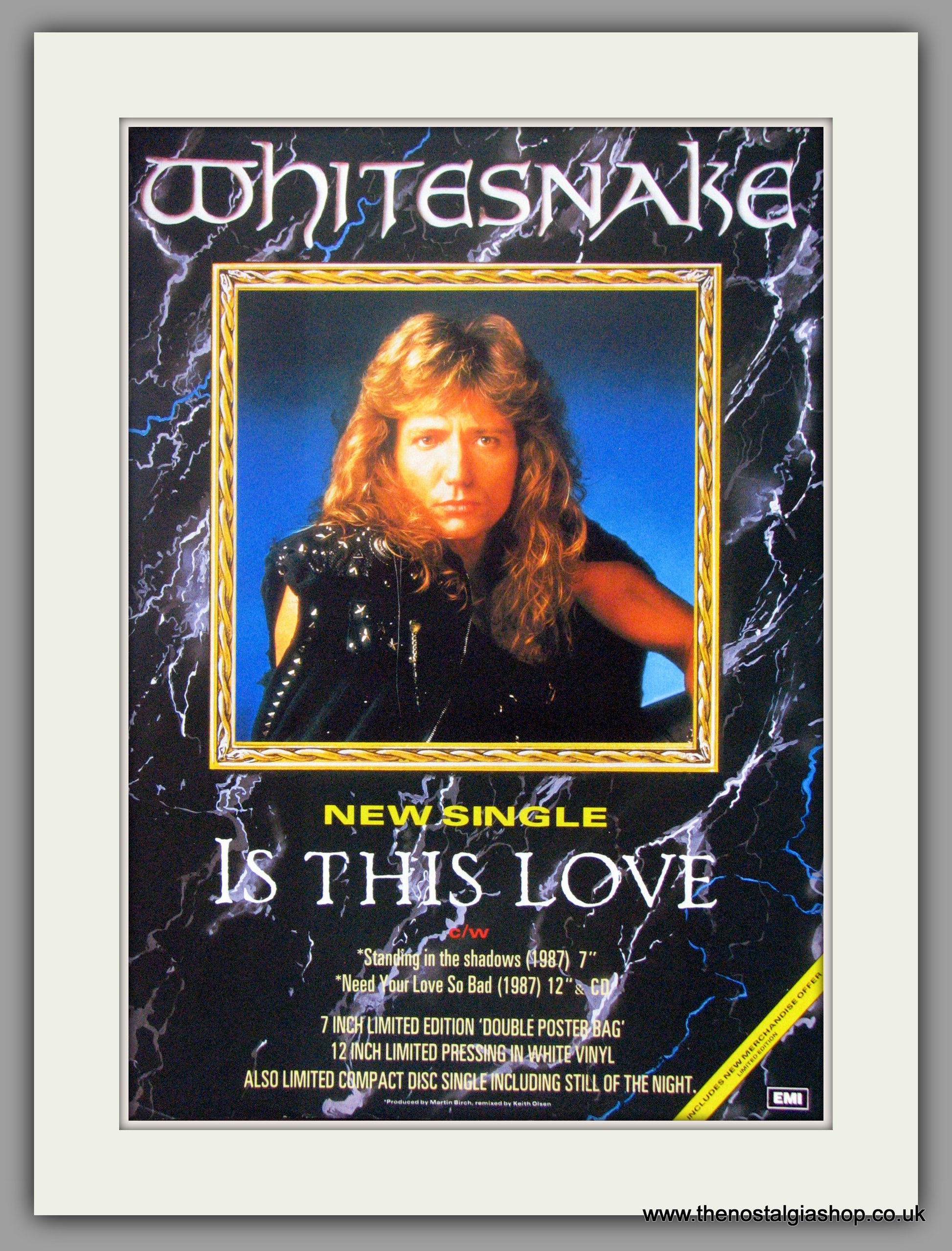 Whitesnake. Is This Love. Classic original advert 1987. Presented in cream bevel cut mount with backing card and clear bag. Ready to fit in 14 x 11 inch frame. Want it framing? If so, buy this then go to Frames Available Category. Click to buy on the suitable frame and we will do the rest. All our adverts, unless clearly stated are Originals from the date shown. They make excellent pieces of wall art and stunning gifts. Many are rare and hard to find and once sold, may not be replaced. Remember you are buying a piece of history. Website watermark is not on original. David Coverdale, John Sykes, Tommy Aldridge, Rudy Sarzo, Adrian Vandenberg, Steve Vai, Bernie Marsden.