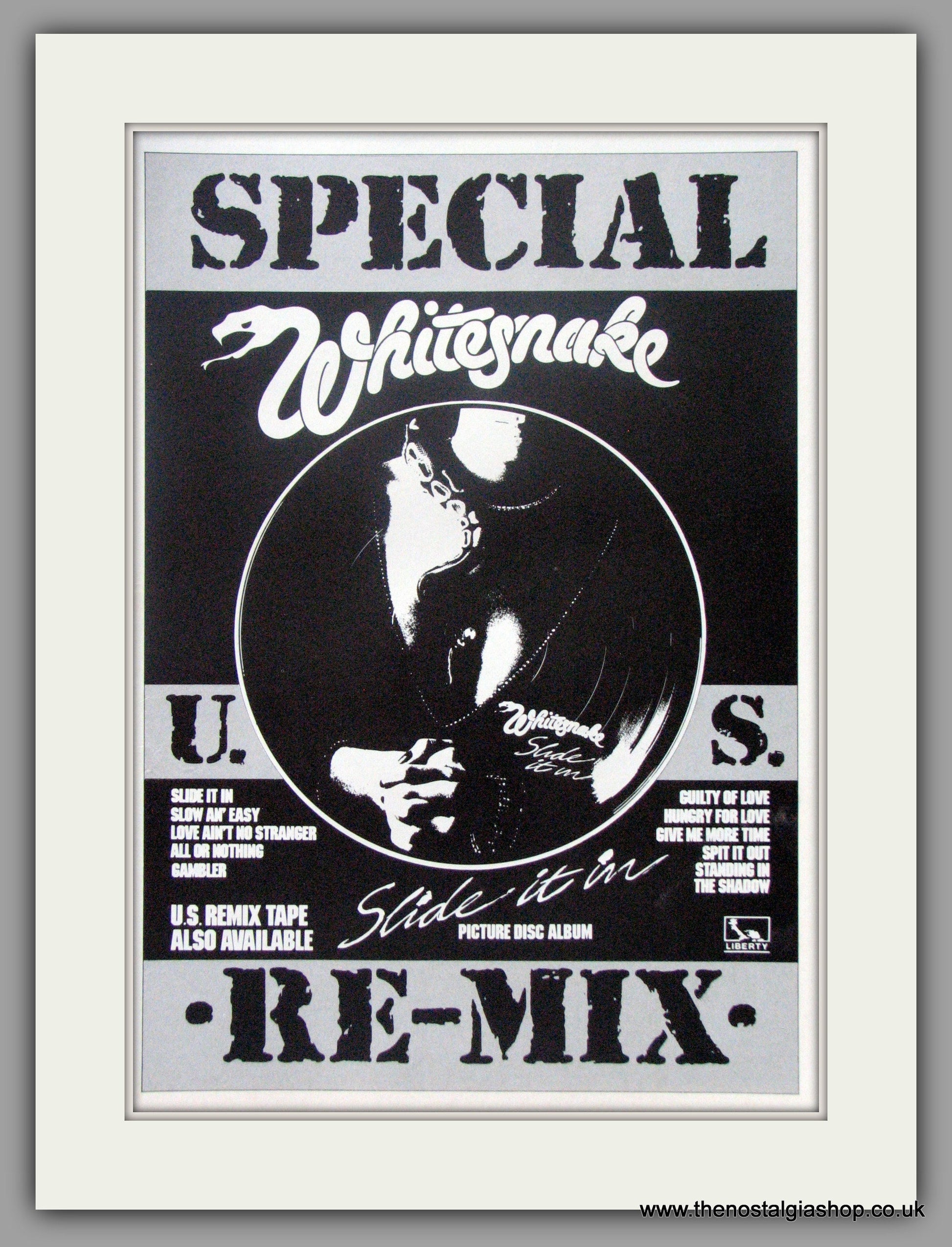 Whitesnake. Slide It In. Original Vintage Advert 1985. Presented and Supplied in cream bevel cut mount with backing card and clear bag. Ready to fit in 20 x 16 inch frame. All our adverts, unless clearly stated are Originals from the date shown. They make excellent pieces of wall art and stunning gifts. Many are rare and hard to find and once sold, may not be replaced. Remember you are buying a piece of history. Website watermark is not on original. David Coverdale, John Sykes, Tommy Aldridge, Rudy Sarzo, Adrian Vandenberg, Steve Vai, Bernie Marsden.