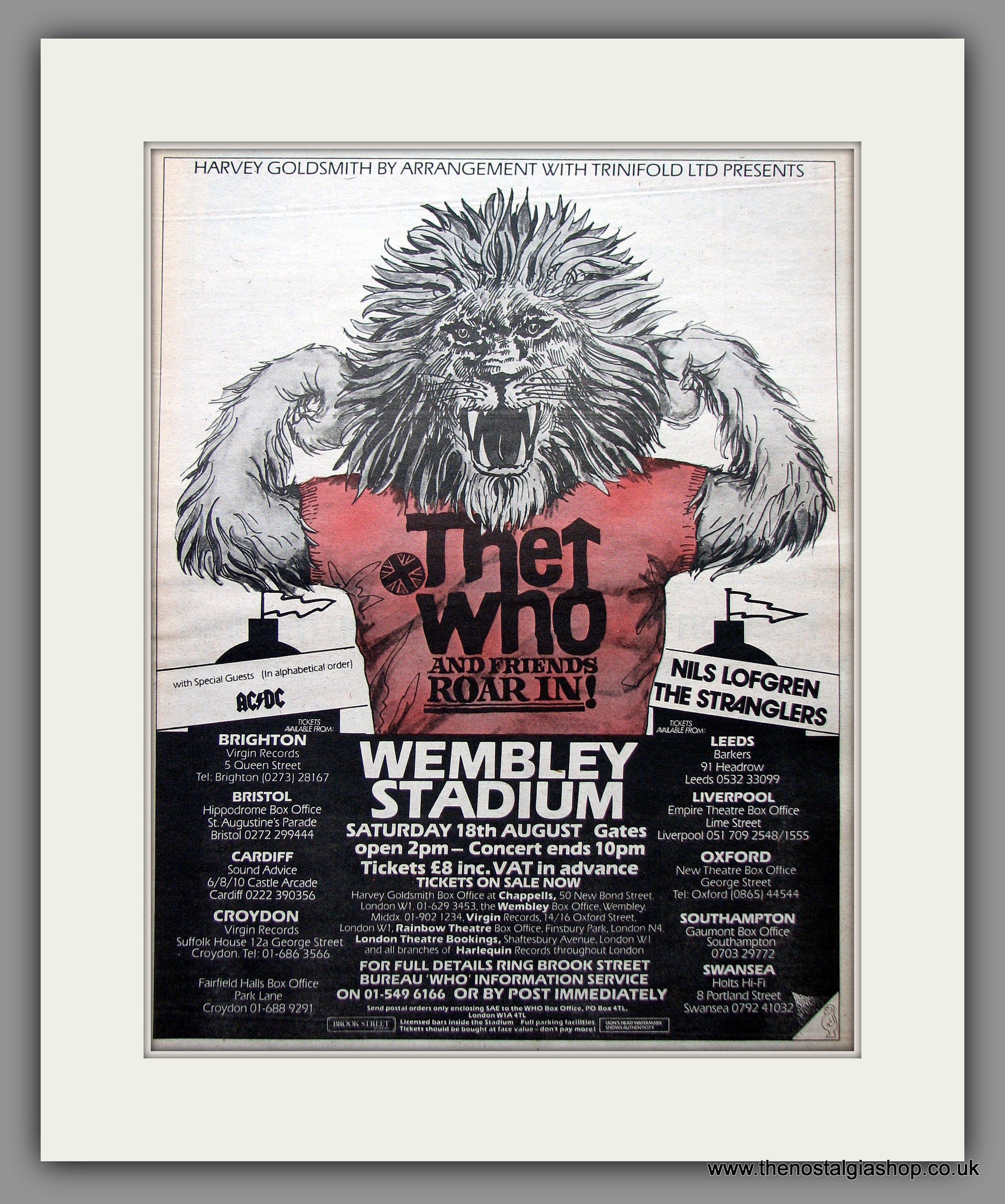 The Who Wembley Stadium, with guests ACDC, Nils Lofgren, The Stranglers. Roger Daltrey, Keith Moon, Pete Townsend, John Entwhistle. This is a large classic Original advert 1979. Presented in cream bevel cut mount with backing card and clear bag. Ready to fit in 20 x 16 inch frame. The mounted advert will be posted via courier and well packed - protected with a sheet of hardboard to keep it rigid. Any questions or inquiries, please get in touch, we are here to help! All our adverts, unless clearly stated are Originals from the date shown. They make excellent pieces of wall art and stunning gifts. Many are rare and hard to find and once sold, may not be replaced. Remember you are buying a piece of history. Website watermark is not on original.