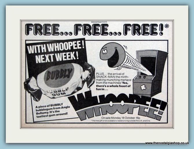 Whoopee. Free with Whoopee next week .Classic original advert 1982. Presented in cream bevel cut mount with backing card and clear bag. Ready to fit in 10 x 8 inch frame. All our adverts, unless clearly stated are Originals from the date shown They make excellent pieces of wall art and stunning gifts. Many are rare and hard to find and once sold, may not be replaced. Remember you are buying a piece of history. Website watermark is not on original.