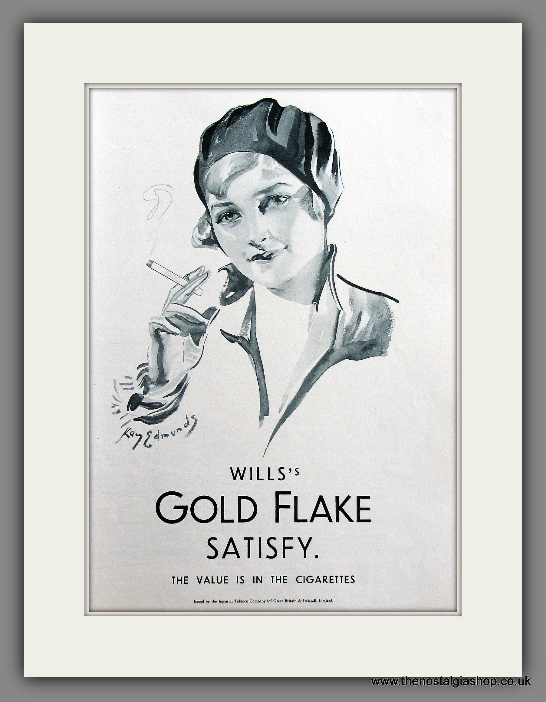 Wills's Gold Flake Cigarettes. Original Vintage Advert 1930. Presented and Supplied in a 18 x 14 Inch cream mount with backing board and clear bag. Ready for Framing. All our adverts, unless clearly stated are Originals from the date shown. They make excellent pieces of wall art and stunning gifts. Many are rare and hard to find and once sold, may not be replaced. Remember you are buying a piece of history. Website watermarks are not on original. Adverts will be well packed with hardboard to keep rigid in the post.