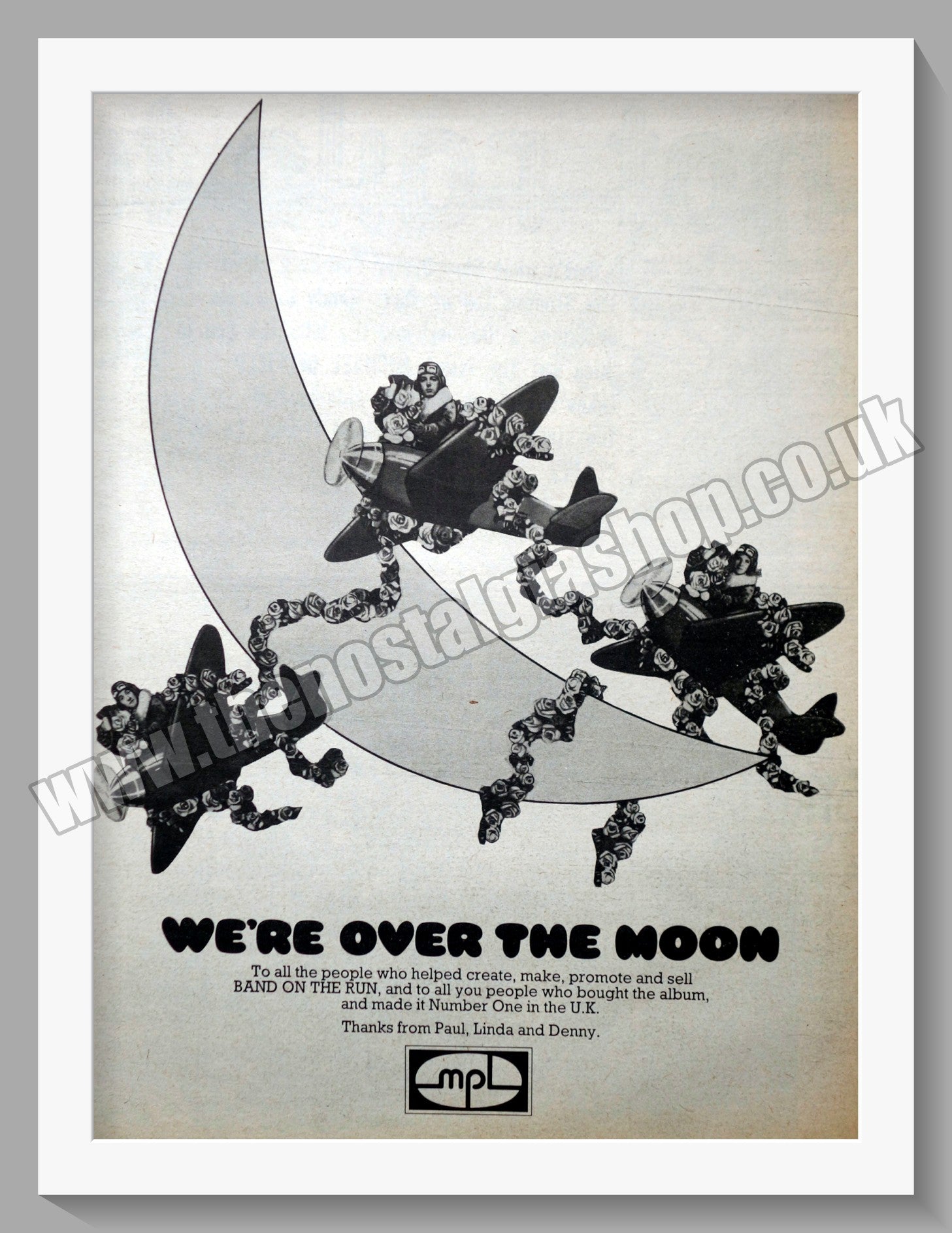 Wings. Band On The Run, Fans Thankyou. Vintage Advert. This is a large classic Original advert 1974. Presented in cream bevel cut mount with backing card and clear bag. Ready to fit in 20 x 16 inch frame. The mounted advert will be posted via courier and well packed - protected with a sheet of hardboard to keep it rigid. Any questions or inquiries, please get in touch, we are here to help! All our adverts, unless clearly stated are Originals from the date shown. They make excellent pieces of wall art and stunning gifts. Many are rare and hard to find and once sold, may not be replaced. Remember you are buying a piece of history. Website watermark is not on original. Paul McCartney, Linda McCartney, Joe English, Denny Laine, Jimmy McCulloch.