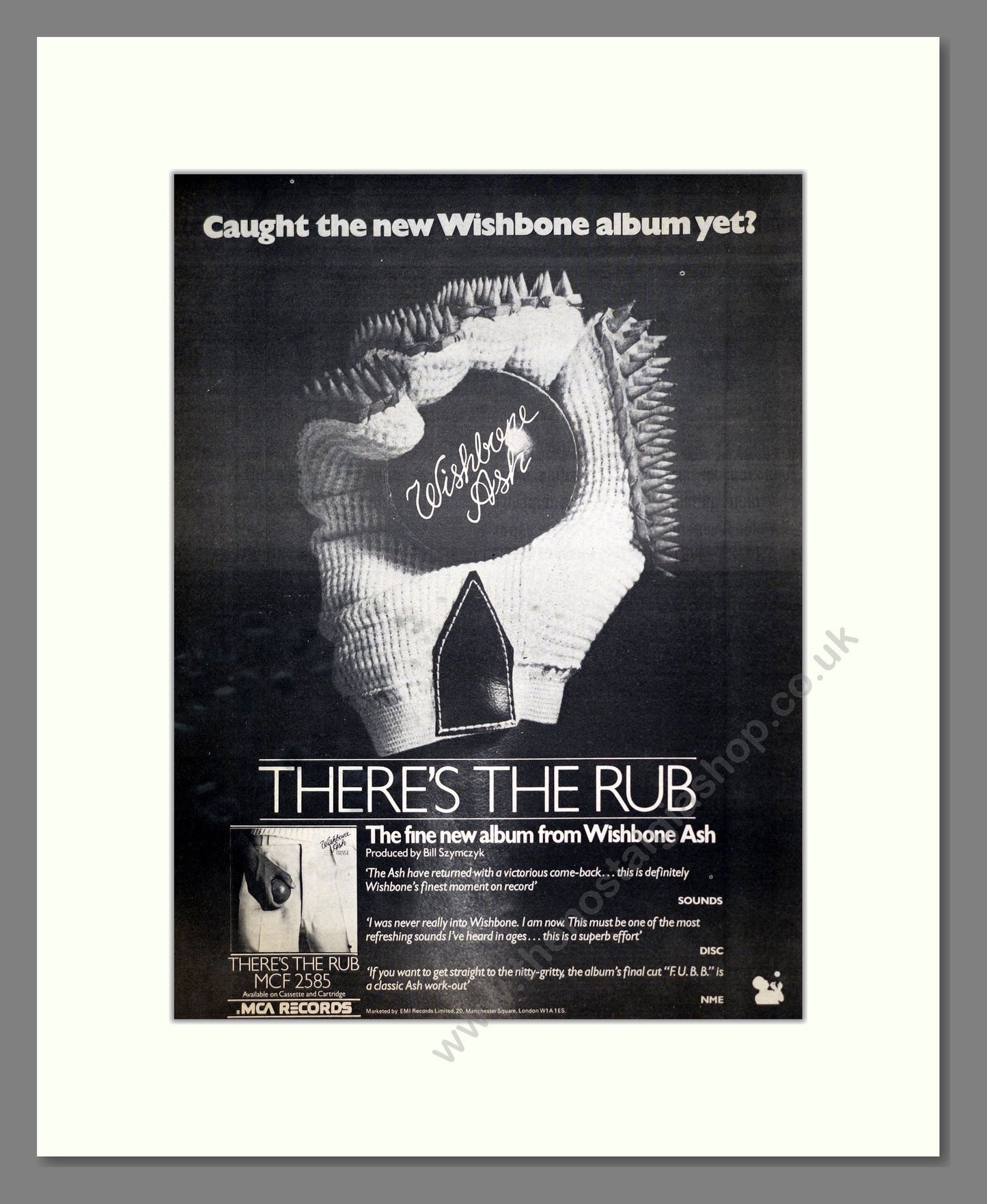 Wishbone Ash - There's The Rub. Vintage Advert. This is a large classic original advert from 1975. Presented and supplied in a cream bevel cut mount with backing card and clear bag. Ready to fit in a 20 x 16 inches frame. The mounted advert will be posted via courier and well packed - protected with a sheet of hardboard to keep it rigid. Any questions or enquiries, please get in touch, we are here to help! All our adverts, unless clearly stated are originals from the date shown. They make excellent pieces of wall art and stunning gifts. Many are rare and hard to find and once sold, may not be replaced. Remember you are buying a piece of history. Website watermark is not on original.