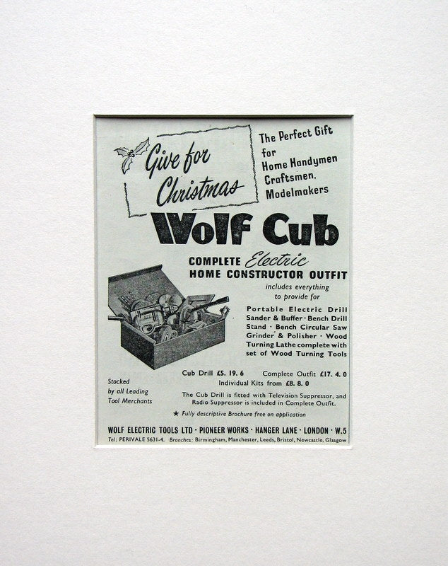 Wolf Cub Wolf Cub Complete electric home constructor outfit. Classic original advert 1953. Professionally sealed and presented in cream bevel cut mount with backing card. Ready to fit in 9 x 7 inch frame. Want it framing? buy this then go to Frames Available Catagory. Click to buy on the suitable frame and we will do the rest. All our adverts, unless clearly stated are Originals from the date shown They make excellent pieces of wall art and stunning gifts. Many are rare and hard to find and once sold, may not be replaced.Remember you are buying a piece of historic Nostalgia