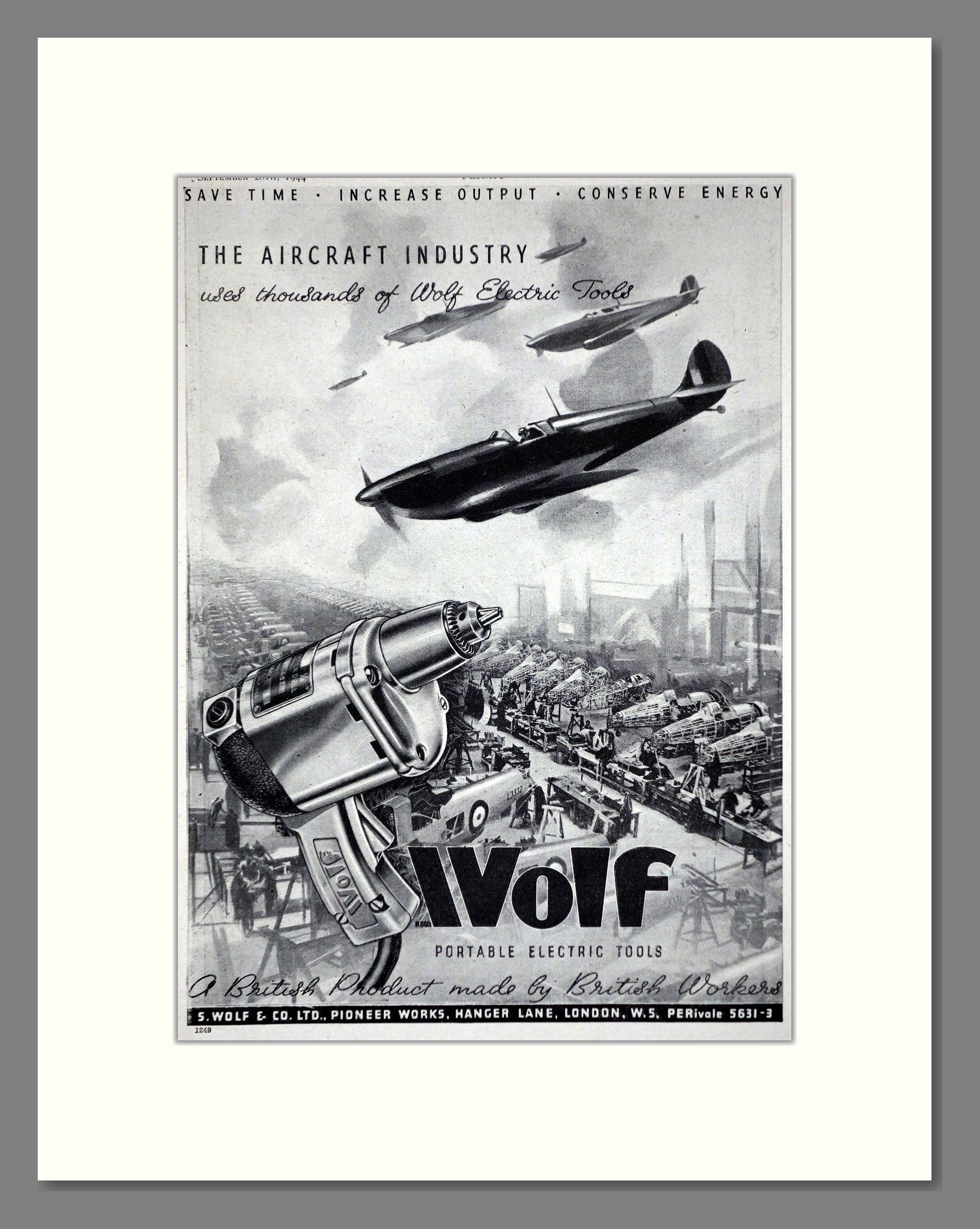 Wolf - Portable Electric Tools. Vintage Advert. This is a classic original advert from 1944. Presented and supplied in a cream bevel cut mount with backing card and clear bag. Ready to fit in a 14 x 11 inches frame. The mounted advert will be posted via courier and well packed - protected with a sheet of hardboard to keep it rigid. Any questions or enquiries, please get in touch, we are here to help! All our adverts, unless clearly stated are originals from the date shown. They make excellent pieces of wall art and stunning gifts. Many are rare and hard to find and once sold, may not be replaced. Remember you are buying a piece of history. Website watermark is not on original.