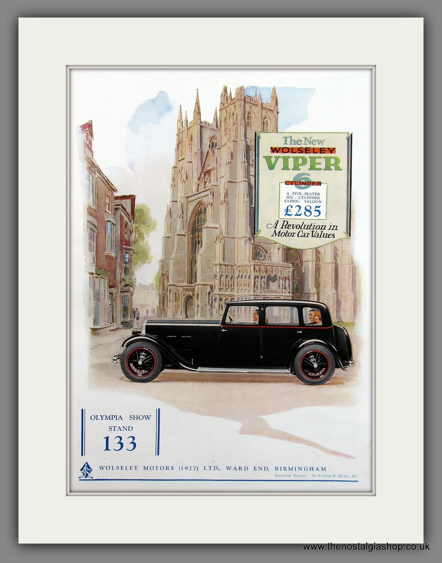 Wolseley Viper 6 Cylinder. Original Vintage Advert 1930. Presented and Supplied in a cream bevel cut mount with backing card and clear bag. Ready to fit in 18 x 14 inch frame. All our adverts, unless clearly stated are Originals from the date shown They make excellent pieces of wall art and stunning gifts. Many are rare and hard to find and once sold, may not be replaced. Remember you are buying a piece of history. Website watermark is not on original.
