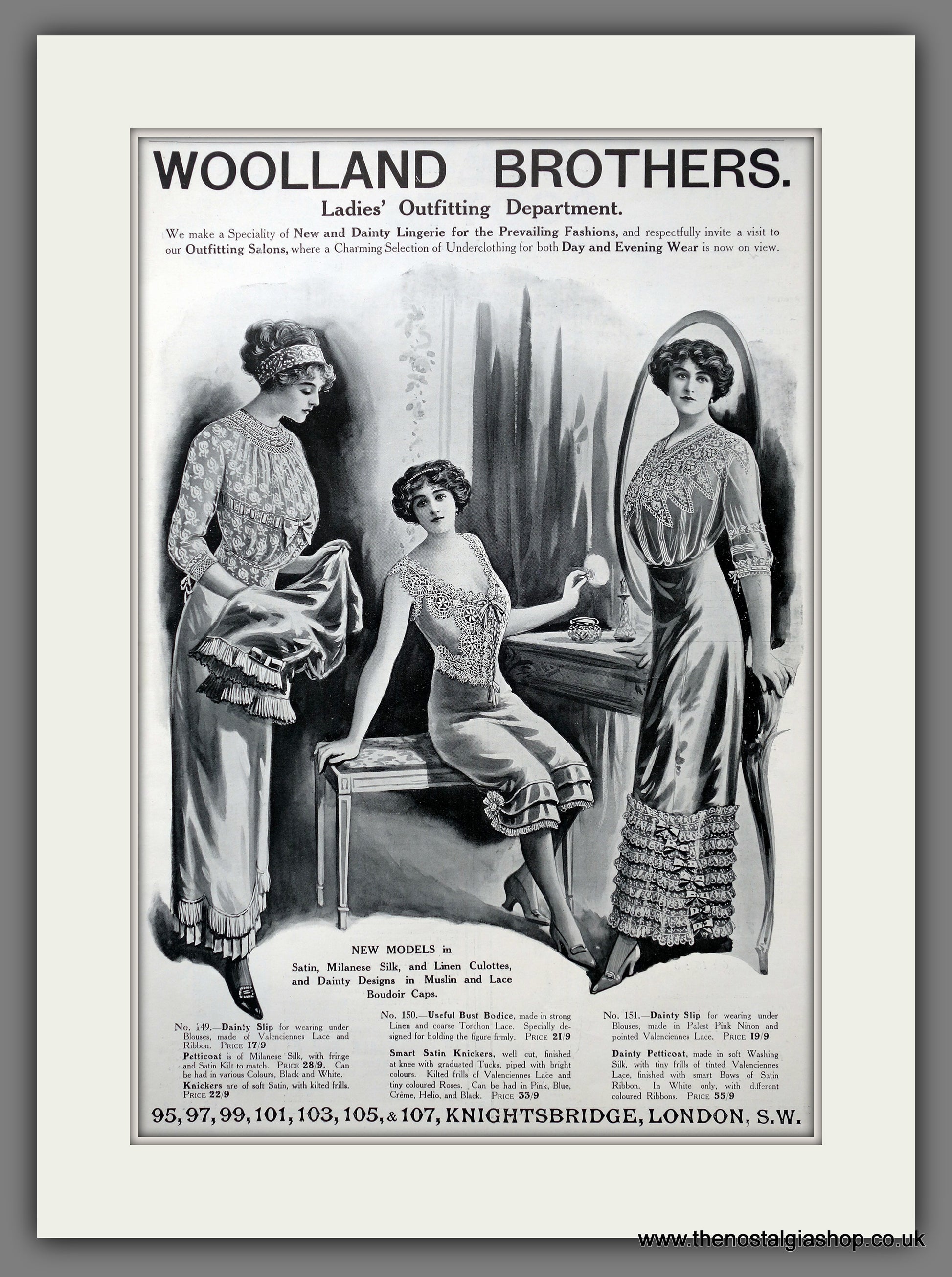 Woolland Brothers Ladies Outfitting. This is a large Original advert 1912. Presented in a 20 x 16 Inch, cream bevel cut mount with backing card and clear bag. The mounted advert will be posted via courier and well packed - protected with a sheet of hardboard to keep it rigid. Any questions or enquiries, please get in touch, we are here to help! All our adverts, unless clearly stated are Originals from the date shown. They make excellent pieces of wall art and stunning gifts. Many are rare and hard to find and once sold, may not be replaced. Remember you are buying a piece of history. Website watermark is not on original. Vintage Corsets. Vintage Underwear.