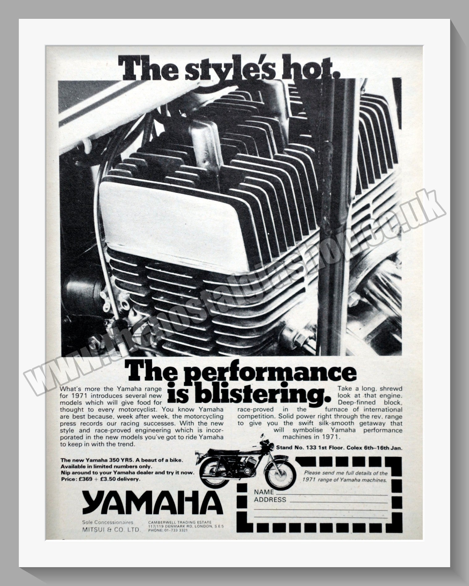 Yamaha 350YR5 Motorcycle. Original Vintage Advert 1971. Presented and Supplied in a 14 x 11 Inch, cream bevel cut mount with backing card. Ready to frame. All our adverts, unless clearly stated are Originals from the date shown They make excellent pieces of wall art and stunning gifts. Many are rare and hard to find and once sold, may not be replaced. Remember you are buying a piece of history. Website watermark is not on original. Yamaha Motorbikes, Vintage Yamaha, Yamaha Motorcycles.