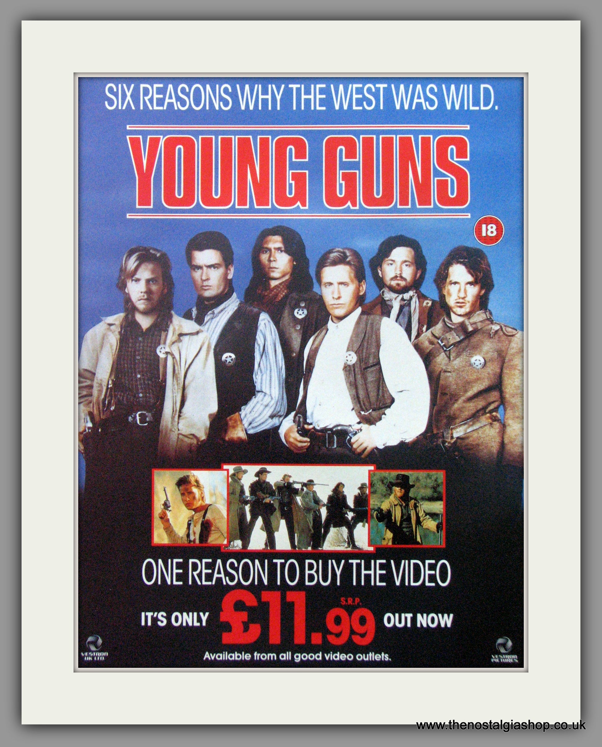 Young Guns-Six reasons why the West was wild. Vintage Advert. Classic Original advert 1990. Presented in cream bevel cut mount, size 14 x 11 inches with backing card and clear bag. Ready to frame. Want it framing? If so, buy this then go to Frames Available Category. Click to buy on the suitable frame and we will do the rest. All our adverts, unless clearly stated are Originals from the date shown They make excellent pieces of wall art and stunning gifts. Many are rare and hard to find and once sold, may not be replaced. Remember you are buying a piece of history. Website watermark is not on original.