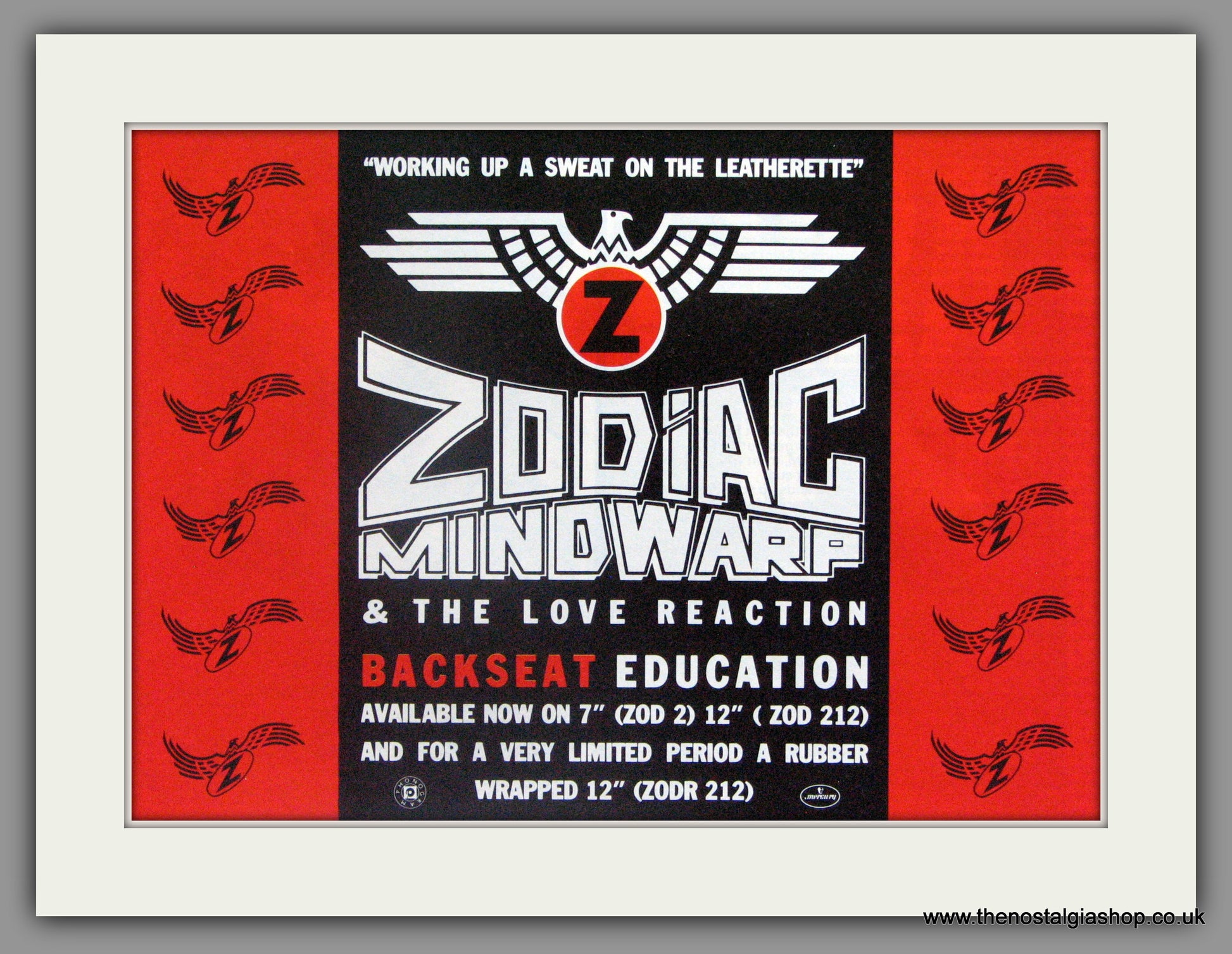 Zodiac Mindwarp and the Love Reaction. Backseat Education. Classic Original advert 1987. Presented in cream bevel cut mount with backing card and clear bag. Ready to fit in 12 x 10 inch frame. Want it framing? If so, buy this then go to Frames Available Category. Click to buy on the suitable frame and we will do the rest. All our adverts, unless clearly stated are Originals from the date shown. They make excellent pieces of wall art and stunning gifts. Many are rare and hard to find and once sold, may not be replaced. Remember you are buying a piece of history. Website watermark is not on original.